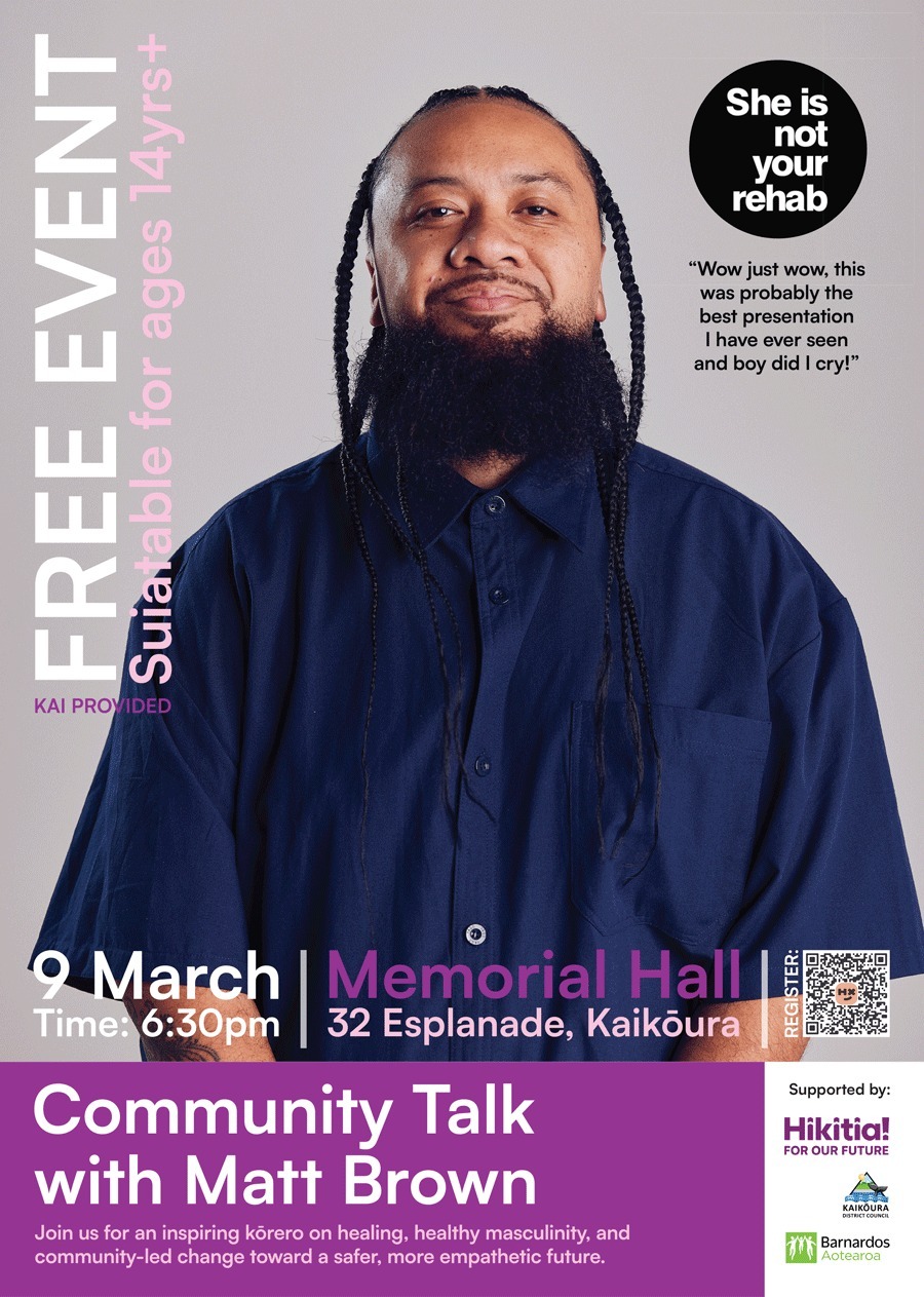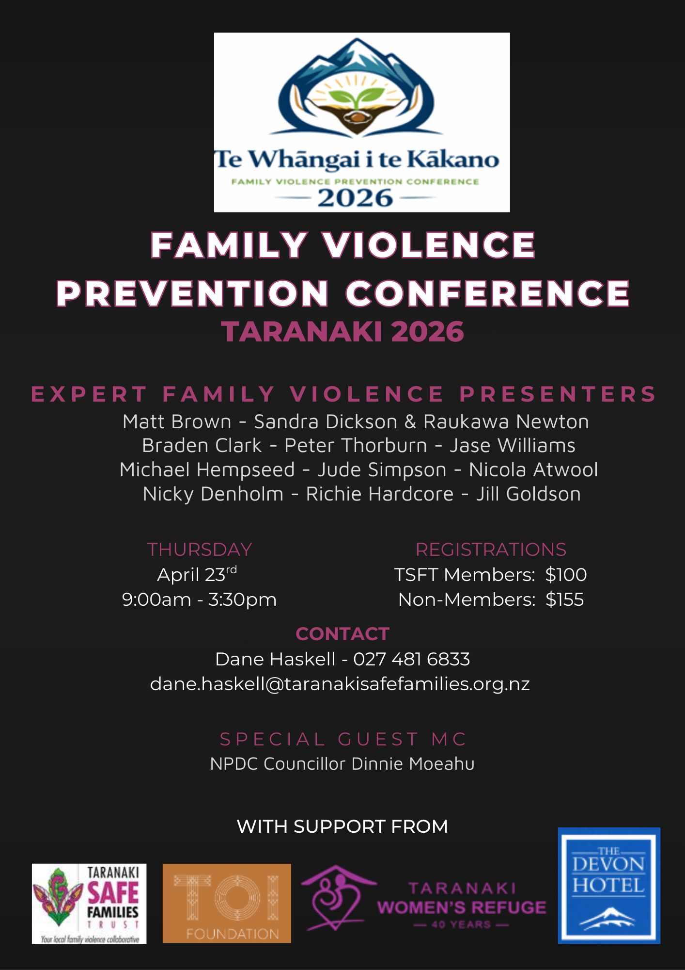 Public Events Community Talk with Matt Brown 9 March, 6:30pmMemorial Hall, 32 Esplanade, Kaikōura register here 2026 Asia Pacific Coercive Control & Children Conference 17 – 19 MarchRoundhouse at UNSW Sydney register here Family Violence Prevention Conference 23rd April, 9am – 3:30pmThe Devon Hotel, New Plymouth